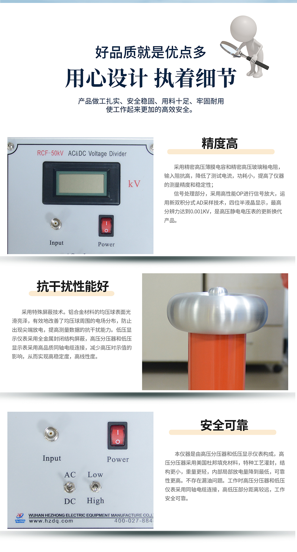 采用特殊屏蔽技術(shù)。鋁合金材料的均壓球表面光滑亮澤,有效地改善了均壓球周圍的電場分布,防止出現(xiàn)尖端放電,提高測量數(shù)據(jù)的抗干擾能力。低壓顯示儀表采用全金屬封閉結(jié)構(gòu)屏蔽,高壓分壓器和低壓顯示表采用高品質(zhì)同軸電纜連接,減少高壓對示值的影響,從而實(shí)現(xiàn)高穩(wěn)定度,高線性度。
