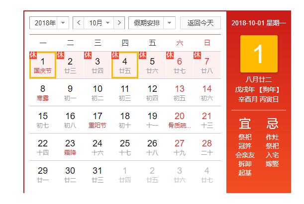 一、國(guó)慶節(jié)放假時(shí)間為:2018年10月1日(周一)至2018年10月7日(周日),放假共7天假期,2018年10月8號(hào)(周一)正常上班。2018年9月29日(星周六)、9月30日(周日)為正常上班。