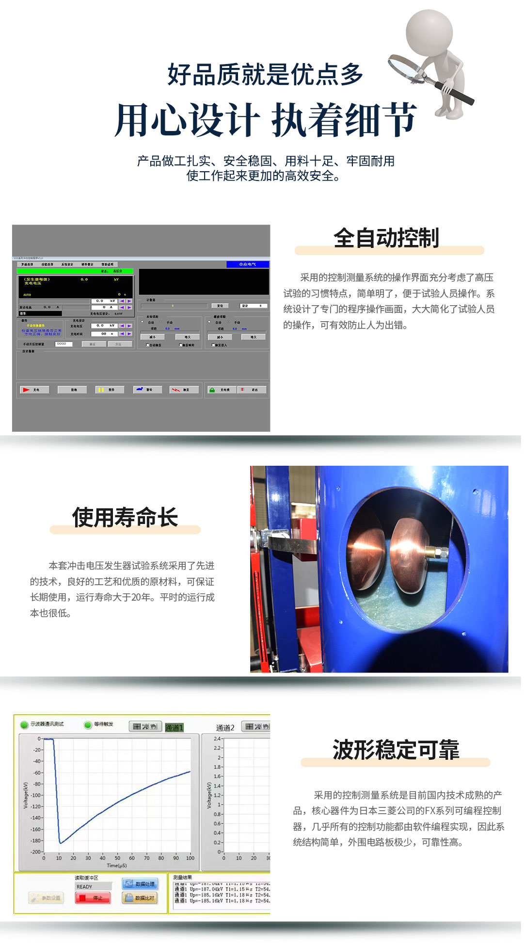 6、本套沖擊電壓發生器試驗系統采用了先進的技術,良好的工藝和優質的原材料,可保證長期使用,運行壽命大于20年。平時的運行成本也很低。