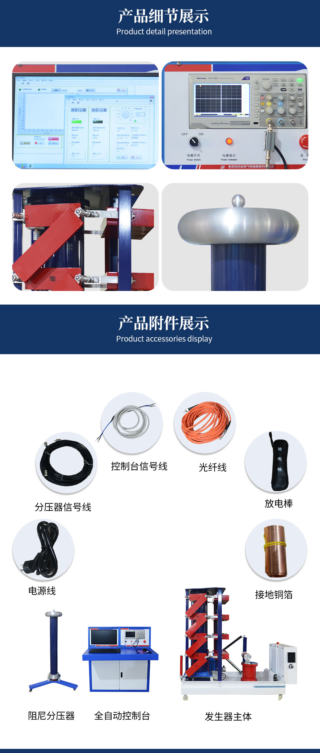 波頭時間:1.2±30%μs,波尾時間:50±20%μs,過沖:小于5%,效率:不低于90%。±1.2/50μs標準雷電沖擊電壓全波,效率大于90%。