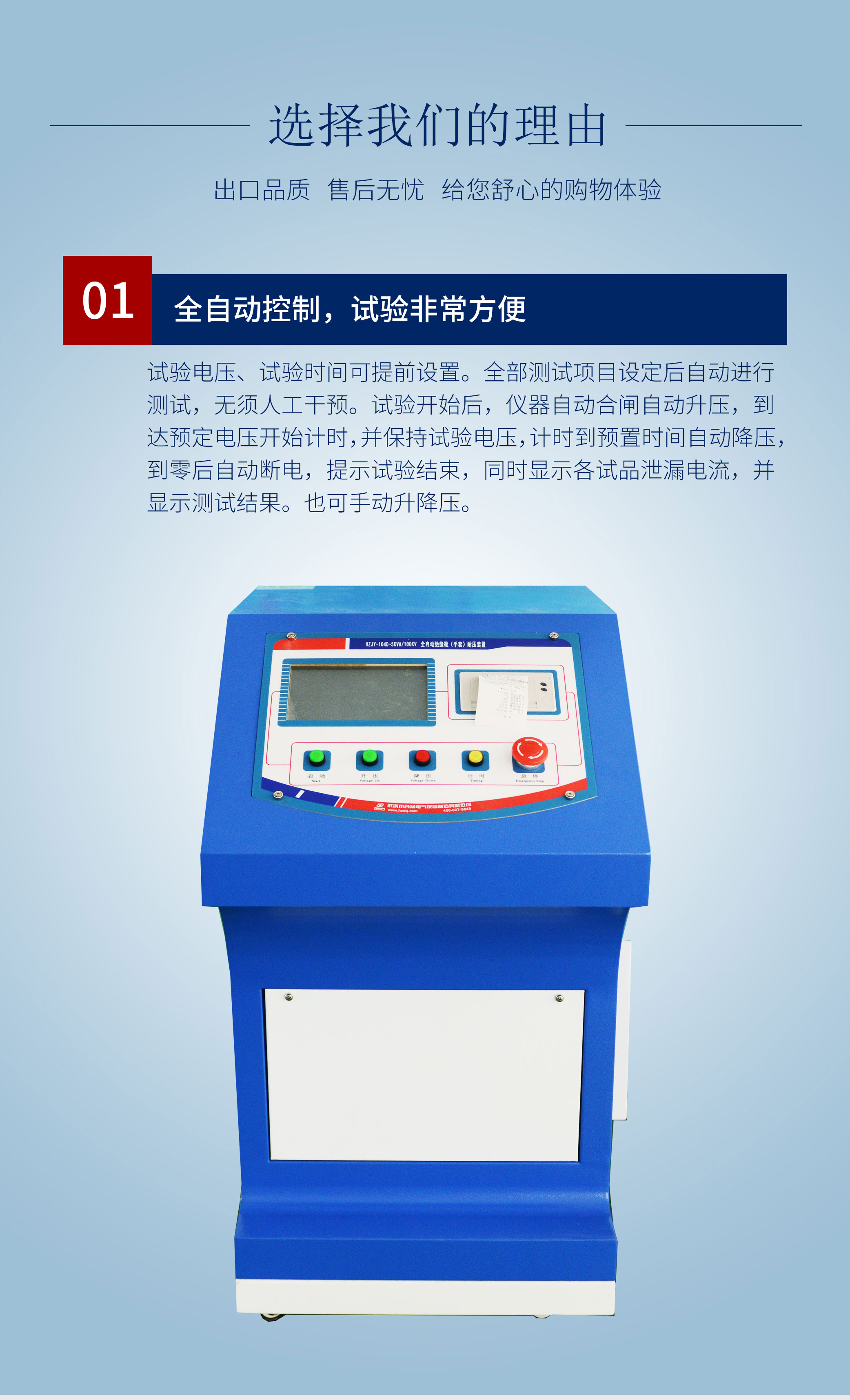 1、全自動操作:試驗電壓、試驗時間可提前設置。全部測試項目設定后自動進行測試,無須人工干預。試驗開始后,儀器自動合閘自動升壓,到達預定電壓開始計時,并保持試驗電壓,計時到預置時間自動降壓,到零后自動斷電,提示試驗結束,同時顯示各試品泄漏電流,并顯示測試結果。也可手動升降壓。