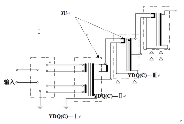 YDQ(C)系列高壓試驗裝置,除最高電壓一級外,都在高壓繞組中串繞激磁組。該繞組和后一級試驗變壓器初級線圈參數相同。