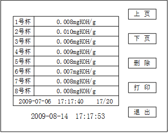 輕觸屏幕上的“上頁”、“下頁”鍵,可以查找測試過的結(jié)果,輕觸“打印”鍵,可以打印頁面顯示內(nèi)容;輕觸“退出”鍵,即退出顯示界面。
