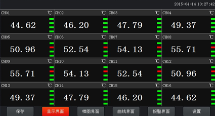 數(shù)顯畫面分為64、48、40、32、24、16、8通道數(shù)顯畫面(8通道有一個綜合顯示畫面),用戶可通過按設(shè)置按鈕進入?yún)?shù)設(shè)置選擇通道數(shù)目即可實現(xiàn)所需要通道顯示數(shù)目的顯示界面。如下圖為16通道顯示界面。