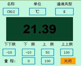 下圖為顯示畫面單個通道的具體內(nèi)容,其中包含通道名稱、單位、測量值和報警標志四個部分。報警標志從上到下依次為上上限報警、上限報警、下限報警、下下限報警。數(shù)值正常時,報警標志為綠色,當(dāng)超過報警值時,對應(yīng)的報警標志會由綠色變?yōu)榧t色(或者是:出現(xiàn)報警時,對應(yīng)的報警標志會由綠色變?yōu)榧t色)報警值可以在參數(shù)設(shè)置里設(shè)置。