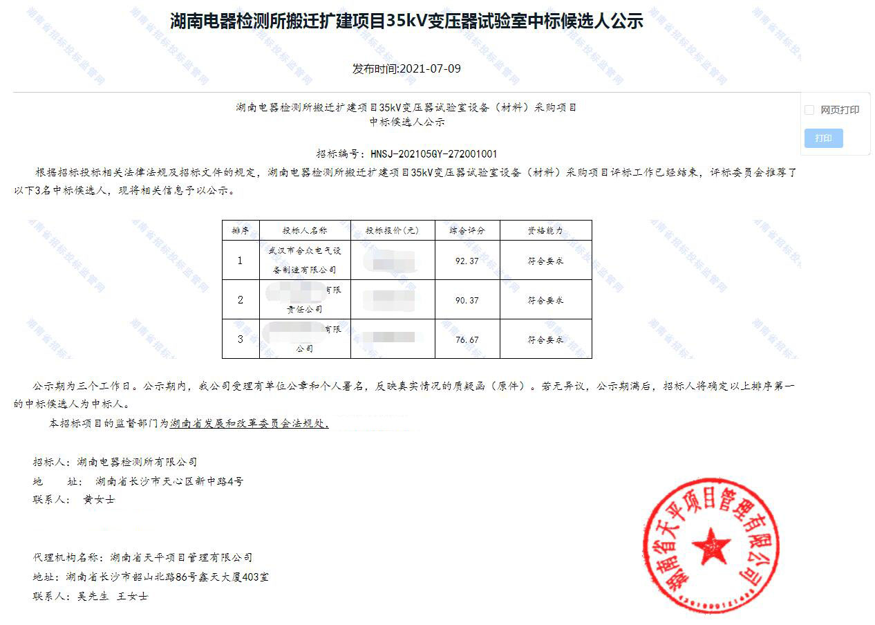 近日湖南電器檢測所35kV變壓器試驗室項目招標候選結(jié)果公示發(fā)布,根據(jù)招投標相關(guān)法律法規(guī)及招標文件規(guī)定,湖南電器檢測所35kV變壓器試驗室設(shè)備(材料)采購項目評標工作已經(jīng)結(jié)束,評標委員會推薦的中標候選人相關(guān)信息已公示,武漢市合眾電氣設(shè)備制造有限公司以公示排序第一中標人中標。