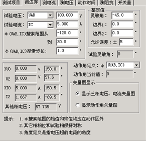 微機繼電保護測試儀的測邊界作者:合眾電氣發布時間:2021-08-16瀏覽量:4068 次字體顯示:【大】【中】【小】 微機繼電保護測試儀的測邊界。 測邊界 自動測試出方向性保護的兩個動作邊界,并且自動計算出最大靈敏角。在“顯示動作角矢量圖”的顯示方式下,從主界面右側的圖中可以很直觀地觀察到兩條邊界線和最大靈敏線。上一篇: 微機繼電保護測試儀試驗參量下一篇: 微機繼電保護測試儀測試項目的界面說明