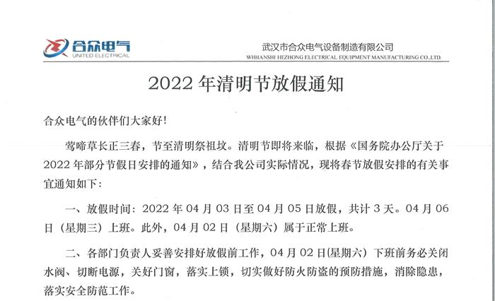 武漢市合眾電氣2022年清明節(jié)放假通知