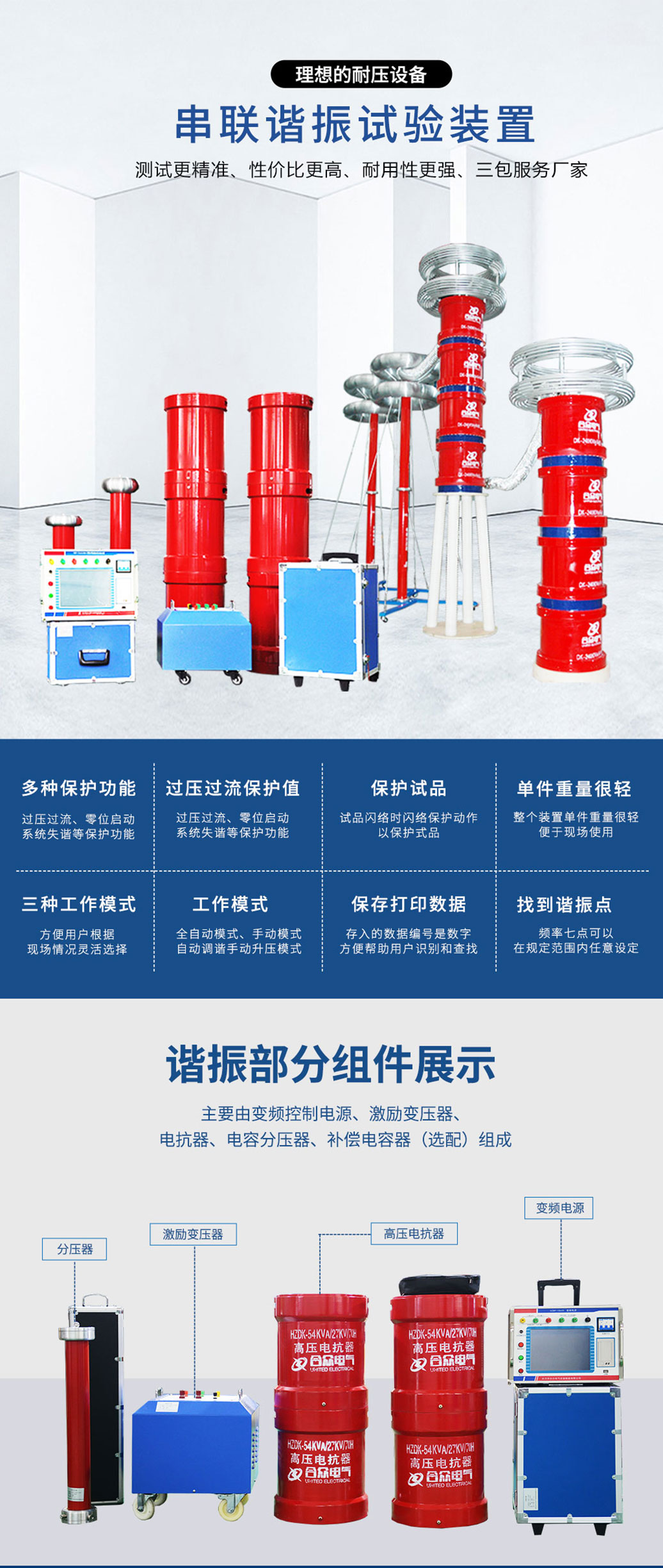 *串聯諧振試驗裝置主要針對交聯電纜、水力發電機、主變、母線、GIS等的交流耐壓試驗,具有較寬的適用范圍,是地、市、縣級高壓試驗部門及電力安裝、修試工程單位理想的耐壓設備。
