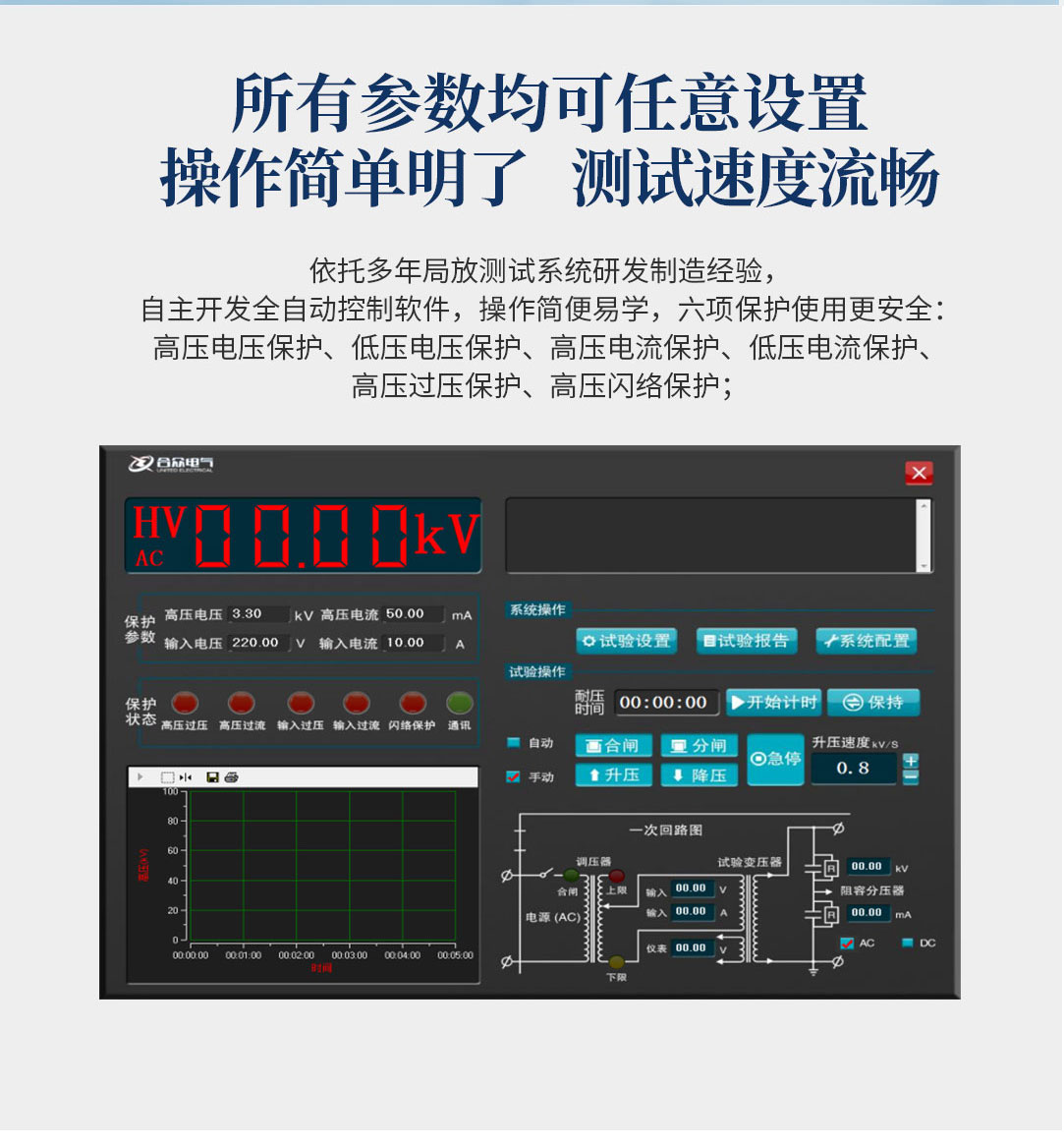 6、所有測試參數可提前進行設置,能達到高壓電壓放電擊穿電壓準確記憶、儲存、復位一系列功能;自動掃描時間設定,自動存儲電老化過程中的時間、電壓、電流等詳細記錄,方便用戶查看;