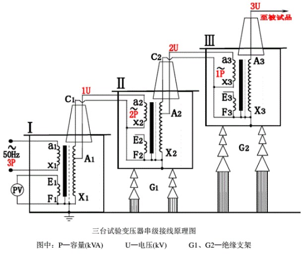 單臺試驗變壓器的電壓不會太高,當(dāng)試驗需要較高的試驗電壓時,常采用幾臺變壓器串接的方法來提高試驗電壓。